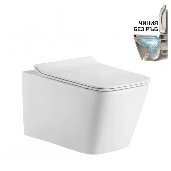 Порцеланова тоалетна чиния за стенен монтаж. Тоалетните без ръб стават все по-популярни. За разлика от стандартните модели, имат малка промяна в конструкцията, в която няма ръб, но въпреки това водата облива чинията без да излиза от нея. Това води до предимства , едно от тях е лесното почистване. Няма нужда от огромни количества препарат, нито специална, по-малка четка за ръба. Цялата тоалетна се почиства лесно, бързо и с едно движение.