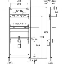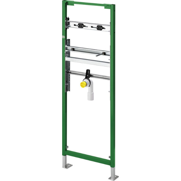 Прахово-боядисана стоманена рамка, усилен панел за окачване на арматура, шумоизолираща конструкция за Viega стенни колена за батерия, канализационно коляно DN40/50, гумен нипел DN40/30, крепежни елементи за фиксация към под и санитарна керамика, самонарезни винтове за фиксиране към монтажен профил, отвор ф11мм за окачване към дървена конструкция, помощ за подравняване